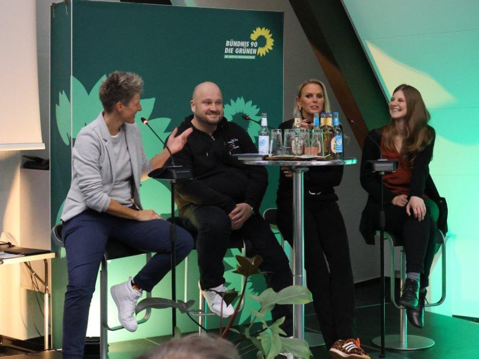 Im Anschluss stellte Sina Beckmann, Sprecherin der Grünen-Landtagsfraktion für Künstliche Intelligenz, Innovationen und Startups, das neue KI-Grundsatzpapier der Fraktion vor. Sie hatte das Papier initiiert und den Abend konzipiert. Zu Beginn ihrer Rede fragte sie in den Saal: „Wer hatte heute schon Kontakt zu KI?“ Viele Hände gingen nach oben. Beckmann lächelte: „Genau das meine ich. Wir alle nutzen KI längst – oft, ohne es zu merken.“ Sie nannte Beispiele aus dem Alltag: Spotify, das Musikvorschläge macht, Google Maps, das hilft, Staus zu umgehen, oder ChatGPT, das Texte formuliert. „Die Frage ist also nicht, ob KI kommt“, sagte sie, „sondern wie wir sie gestalten.“
